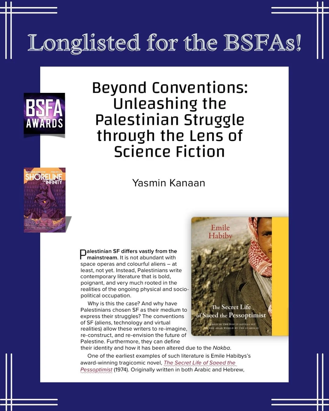 I am incredibly honoured to announce that my essay, "Beyond Conventions: Unleashing the Palestinian Struggle Through the Lens of Science Fiction," featured in Shoreline of Infinity 37, has been shortlisted for the BSFA Short Non-Fiction Award! Thank you to everyone who voted for me. You can read my article here.